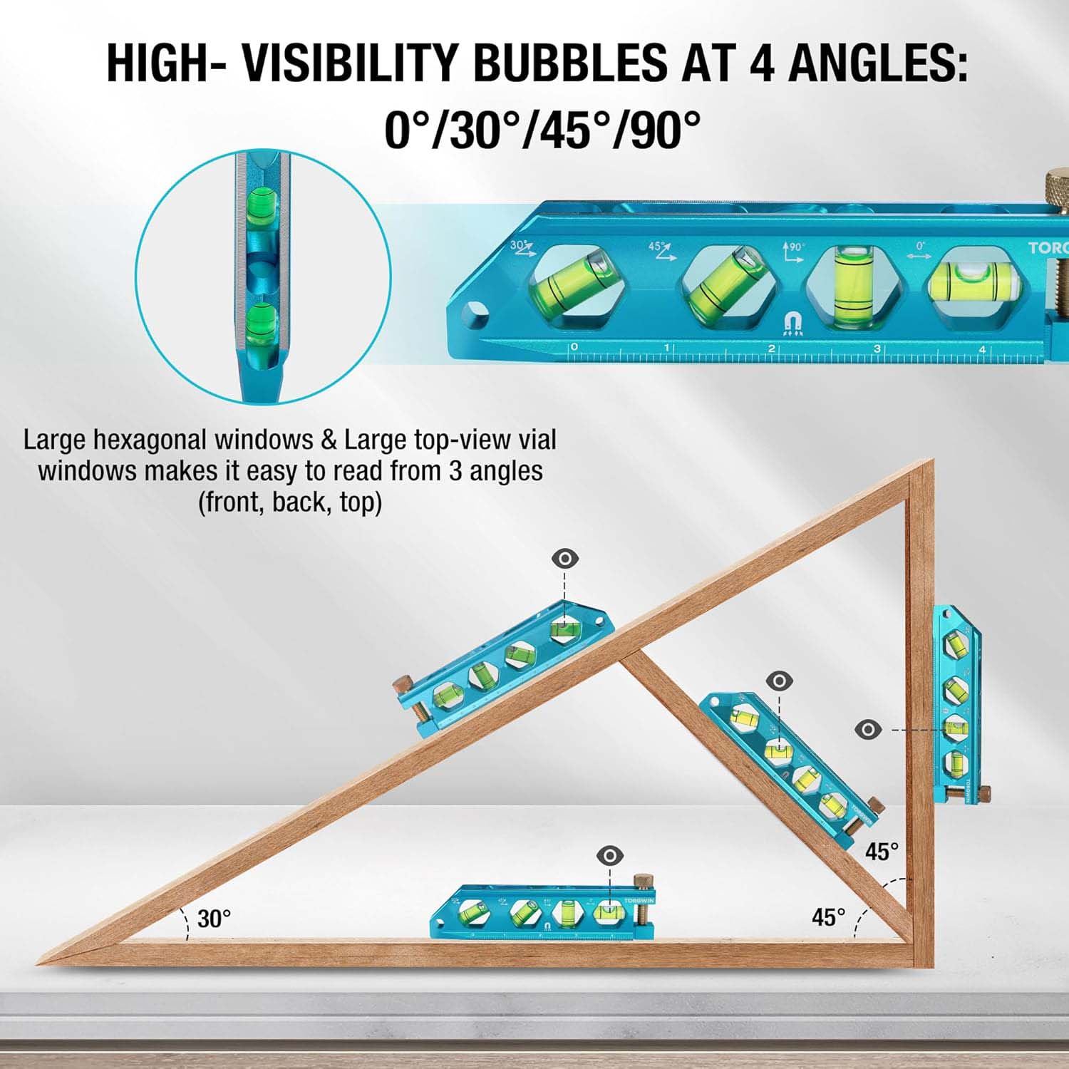 Ngarsane dhuwur - gelembung visibilitas ing 4 ngarep (0 ° / 30 ° / 45 ° / 90 °) minangka kauntungan gedhe. Gelembung iki jelas katon saka orientasi sing beda, tegese kita nggawe pangukuran kanthi sudut horisontal utawa vertikal utawa ing sudut sing spesifik kaya 30 ° utawa 45 °, kita bisa entuk maca sing akurat. Akeh macem-macem fitur gelembung iki bisa nambah macem-macem tingkat. Ketepatan saka wacan ditambah amarga umpluk kanthi tepat. Contone, nalika ngukur karep saka permukaan sloped ing sudut 45 °, posisi gelubble bisa menehi tandha-tandha sing akurat banget, kanthi tingkat kesalahan sing kurang saka 0,05 ° Calibble.